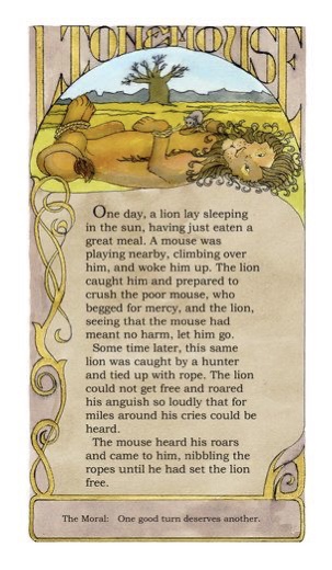 One day, a lion lay sleeping in the sun, having just eaten a great meal. A mouse was playing nearby, climbing over him, and woke him up. The lion. caught him and prepared to crush the poor mouse, who begged for mercy, and the lion, seeing that the mouse had meant no harm, let him go.